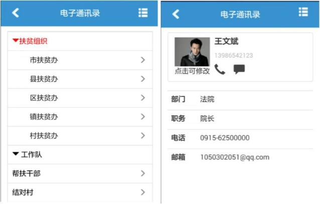 系统提供电子通讯录功能,可以通过APP快速查找各级扶贫组织、帮扶单位、工作队、帮扶干部、帮扶对象的通讯录,基于通讯录可以拔打电话和发送短信,便于大家沟通交流。